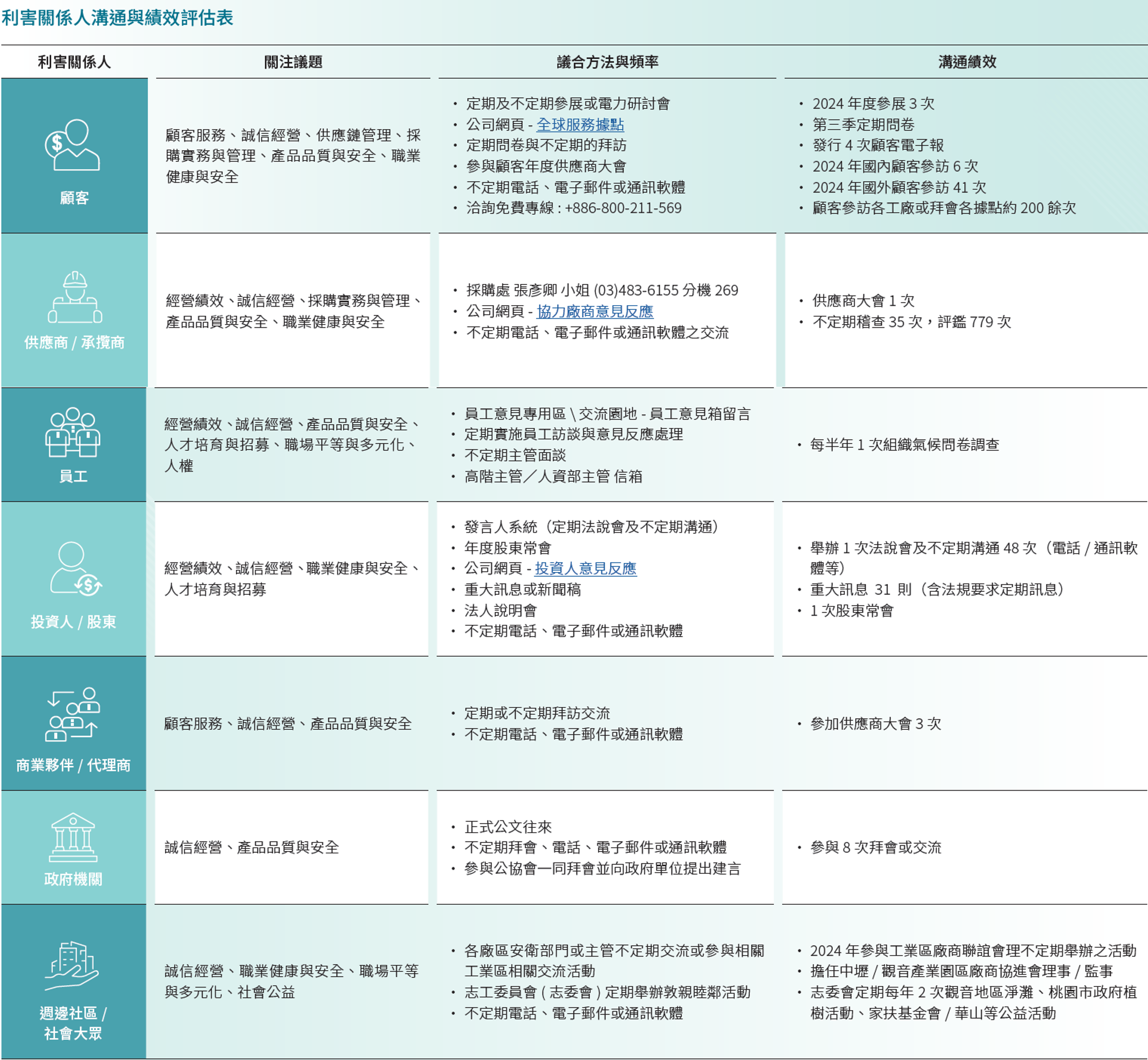 提供利害關係人(如員工、供應商、消費者或客戶等)相關聯絡方式,供其詢問及發表意見,以瞭解利害關係人之合理期望及需求,並提供妥適回應機制,如專欄、問答集、個案回覆等方式,處理利害關係人所關切之議題。
